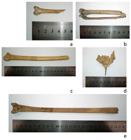 Some avian bone finds from Bulgarian Chalcolithic settlements: Tetrax tetrax, femur dex. dist. ad. NMNHS 16490 from Hotnitsa (a); Gypaetus barbatus, carpometacarpus dex. ad. NMNHS 16493 from Hotnitsa (b); Cygnus olor, ulna sin. ad. NMNHS 16489 from Hotnitsa (c); Aythya ferina, sternum ad. NMNHS 2905 from Sozopol (d); Grus grus, tibiotarsus sin. juv. NMNHS 1178 from Sozopol. (e) Photographs: Z. Boev.