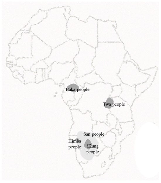 The Khoisan are considered the earliest inhabitants of southern Africa. This group is divided into two main branches: the Khoe and the San. The San peoples, often referred to as Saan or Bushmen, encompass various indigenous hunter–gatherer cultures in southern Africa. Among them, the ǃKung predominantly inhabit the western edge of the Kalahari Desert. Historically, this group relied on traditional hunting and gathering methods for their livelihood until the last decades. The Himba, also known as OvaHimba, are a hunter–gatherer group with about 50,000 individuals, mainly residing in northern Namibia. The Twa people, another hunter–gatherer community, are spread across the Democratic Republic of Congo, including the Great Lakes Twa, who live in the dense forests near the Ruwenzori mountains. The Baka community focuses on hunting and gathering and resides in the southeastern rainforests of Cameroon (Figure 1). Langdon [] mentions that modern hunter–gatherers may behave like early hominins in terms of ‘patterns of living’. The discussion here is based on the idea that although there is little clear evidence concerning domed huts or beehive huts closely resembling the shelters built by archeologically and/or ethnohistorically documented African populations, the settlement organisation and beehive-shaped or circular planned huts of these people may share similarities with the shelters constructed by early Homo species.