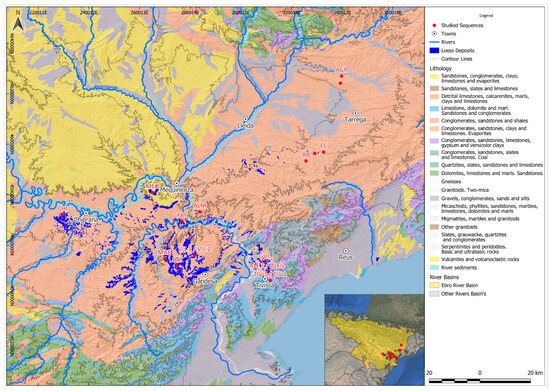 In the Ebro River Basin, the first studies reported deposits of ‘gypsiferous silts’ [25,27,28] and, occasionally, mentioned the formation of soil on loess in areas of the Northeast of the peninsula [26,29,30]. However, they were not studied in detail until the systematic studies carried out by Boixadera et al. [31] and later by Plata [32]. Currently there are thirteen LPSs located in the Ebro basin and Cubeta de Mora and four sequences in striations of the Alemenara Range and northeast of Girona (Figure 1).