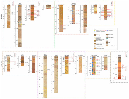 Research until now in this area includes the study of their origin and source areas [33,34] as well as the detailed description and sampling of the sequences for physico-chemical and micromorphological analyses [31,33,35,36,37]. A more detailed characterisation of some of the most relevant pedofeatures has been included, such as the description of the rubefaction processes in some profiles [35], the evolution of their structure at different scales [36], the formation of a special type of biocalcifications called ‘queras’ [37], and different types of pedogenic gypsum accumulations [38]. Moreover, for most of the sequences, luminescence dating techniques were applied (OSL and pIR250), which allow us to know the time of their deposition [31,33,34,35,36,37].