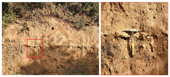 All the analysed sequences exhibit evidence of carbonate translocation, manifested as secondary carbonate accumulations. Pseudomycelia, nodules, and rhizoconcretions (as loess dolls) are predominant, reaching Machette stage II [81,82]. The latter can form cemented horizons by coalescence, as seen in a Bkm horizon of the BSC sequence (Machette stage III [81,82]). The radiocarbon age of this petrocalcic horizon with a 95.4% calibration was 23,161 years (cal BC) (14C age without calibration = 20,550 ± 130), indicating a rapid evolution (Figure 4) compared with the limited carbonate mobilisation in the same period for the rest of the sequences.