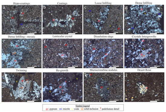 The most common pedofeatures are loose infillings, with some dense infillings displaying xenotopic fabrics, forming mosaic-like crystal arrangements. Coatings and gypsum hypocoatings, often overlaid with micrite, are present in the Mequinenza, Fayón, and Agramunt sequences. Gypsum nodules, either microcrystalline or desert rose-shaped, are unevenly distributed and sometimes indistinguishable from dense infillings. The observed morphologies and pedofeatures do not vary by location but reflect the processes and conditions experienced during their evolution (Figure 7) (Table 1, [38]).