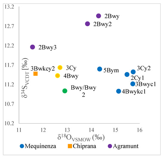 Gypsum sulphate isotopic values range from 11.0 to 13.0‰ for δ34S and from 11.6 to 15.7‰ for δ18O. The Agramunt profile shows higher δ34S values, while Mequinenza has higher δ18O. Isotopic signatures cluster by profile, particularly Fayón, Mequinenza, and Agramunt (Figure 8). The isotopic behaviour varies across profiles: Mequinenza shows an irregular trend with peaks linked to genetic discordances, while Agramunt displays a decreasing trend with more depleted values at greater depths.