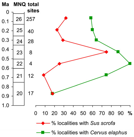 Iannucci tested this statement [6]. He used a published dataset and compared sites from the periods before and after the “suid gap” (2–1.8 and 1.1–1 Ma). He found that Sus was present in 57.1% and 37.5% of the sites, respectively, while the more common species were present in 85.7–100% and 37.5–75% of the sites. This contradicts part of the “suid gap” hypothesis [2]. I used a different dataset [54] and looked at the period after 1 Ma. Sus scrofa (with the largest litter sizes among pigs) and Cervus elaphus appear in his zones MNQ20 to 26. A priori, there is no reason to suppose that Cervus elaphus is more abundant in sites with Rhinocerotidae. Figure 1 gives the percentage of sites per biozone that have Sus scrofa and Cervus elaphus. The number of sites per biozone vary between 4 and 257. About this more in the next section, but the higher the number of sites, the more reliable are the percentages. Especially the last three biozones have many sites and there Cervus elaphus is found in more than twice as many sites than Sus scrofa.