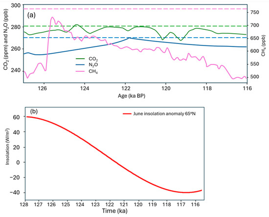(a) from Li et al. [19]. The climate forcings used for the simulations for EEM_Standard and EEM_Down (127 ka–116 ka). The greenhouse gas (GHG) concentrations of CO2, CH4, and N2O are from the PMIP4 protocol [36,37]. The dashed lines represent the pre-industrial values. (b) shows the orbitally-forced June insolation for 65° N, provided as an anomaly from present-day values [8].
