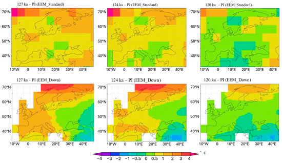 As discussed previously for the Holocene [25], our downscaled simulation EEM_Down depicts climate at a regional scale that is more in line with the spatial scale of proxy data than our EEM_Standard experiment. The improvement resulting from the downscaling technique will affect our results when compared to other climate model simulations and proxy-based reconstructions, particularly as the latter is impacted by local conditions. We have compared our EEM_Down and EEM_Standard results of temperature and precipitation in Europe with proxy-based reconstructions that are currently available and other climate model results to evaluate the performance of our downscaling technique.
