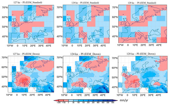 The results for precipitation from EEM_Standard, as illustrated in Figure 3, do not exhibit a pronounced spatial pattern, with fluctuations largely confined to the interval of −100 to +100 mm/yr. Conversely, EEM_Down presents a clear distribution, indicating some areas that are wetter than the pre-industrial, Relative to pre-industrial, there is a wet-dry-wet pattern that has a northwest-southeast direction, with the Atlantic coast (comprising Iberia, Ireland, Scotland, and the Scandinavian coast) being wetter, succeeded by a drier zone that stretches from France and northern Italy to the northeast (Finland and Northern Russia), and finally, wetter conditions in the southeastern section of the domain. The dry region is interrupted by moderately wetter conditions found in central Europe. In the EEM_Down results, this wet-dry-wet pattern is most noticeable at 127 ka and becomes less pronounced in the late Eemian. The drier zone receives decreased precipitation < 200 mm/yr centered around the Alps, while the Atlantic coast and the southeast portion of the domain receive more than 300 mm/yr more precipitation than pre-industrial.