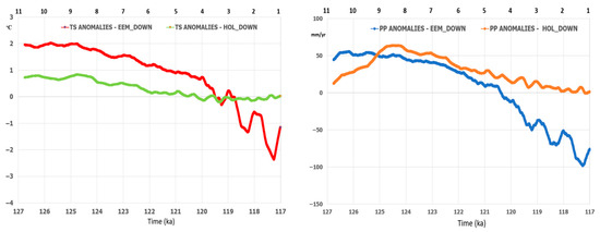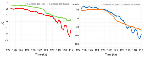 The general temporal trends in temperature and precipitation in Europe display an overall cooling from the early to the late Eemian. Simulated temperature anomalies relative to pre-industrial indicate that at 127 ka, temperatures were 2.5 °C warmer than pre-industrial for EEM_Standard and 2 °C warmer in EEM_Down and started declining steadily after 126 ka in both simulations (Figure 4). A gradually decreasing trend with the warmest conditions in the first part of the experiments is thus observed. Temperatures started decreasing in the mid-Eemian with mean anomalies between (1–1.5 °C) around 123 ka for EEM_Down and 2 °C for EEM_Standard. The general decline continues further till 117 ka. EEM_Standard was generally warmer than EEM_Down,