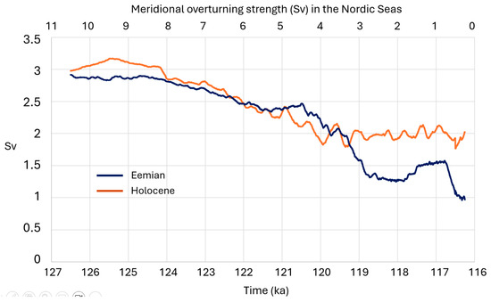 Evolution of the annual maximum meridional overturning streamfunction (Sv) in the Nordic Seas for the Holocene (Orange colour) and the Eemian (Blue colour). The trend shows a 1000 yr running mean.