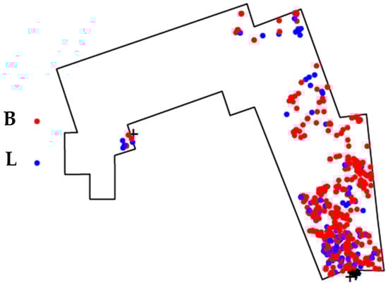 Planimetry of level 22A from DS. Red dots represent faunal remains’ distribution (bone); blue dots represent lithic ones.