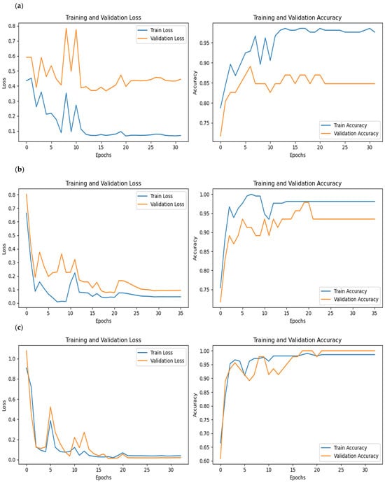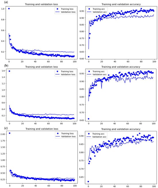 Training and validation loss and accuracy of (a) densenet, (b) resnet50, and (c) resnet152 for cut–trampling models.