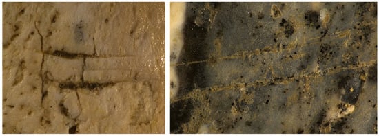 In total, 35 marks—20 possible cuts and 15 scores—were selected and documented through a binocular microscope and compared to cut marks, tooth marks, and trampling marks obtained in controlled conditions in order to ensure the identification of the agents involved in the creation of the assemblage.