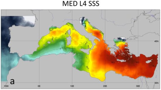 The Mediterranean Sea, due to its semi-enclosed nature and east–west elongation, exhibits a predominantly anti-estuarine circulation pattern. This circulation is mainly driven by a negative water balance and a density gradient with the Atlantic Ocean [26,27,28]. Atlantic surface water, known as Modified Atlantic Water (MAW), enters the Alboran Sea through the Strait of Gibraltar (Figure 2) and occupies the upper 100–200 m of the water column. As it progresses eastward, MAW undergoes changes in salinity and temperature due to intense evaporation and regional mixing processes (Figure 3a) [28,29,30].