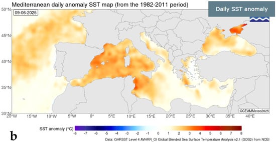 (a) Climatological sea surface salinity (SSS) in the Mediterranean Sea derived from the Copernicus Marine Service, showing the long-term average distribution of surface salinity based on the MEDSEA_REANALYSIS_PHY_006_004 product (1993–2022) [33]. (b) Daily sea surface temperature (SST) anomaly map for the Mediterranean on 9 June 2025, based on deviations from the 1982–2011 climatological mean, derived from the GHRSST Level 4 AVHRR_OI Global Blended SST Analysis (v2.1), provided by CEAM/Meteoce [34].