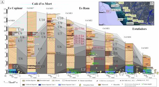 (A) Stratigraphic logs of the analysed outcrops, showing the distribution of sedimentary units and incorporating published OSL ages from Del Valle et al. [18,19]. Gray shading indicates the relative stratigraphic position of each unit, from the basal unit (U1) to the uppermost (U10). Green circles indicate the locations where faunal samples were collected. EC: Es Copinar; ER: Es Ram; ES: s’Estufadors. (B) Topographic map showing the precise locations of the stratigraphic logs referenced in (A).