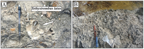 (A) Detail of the marine fauna species Thetystrombus latus present in the Es Copinar section (Lower beach level) Sef-1. (B) Marine fauna of the first beach level from Es Ram Sef-1.