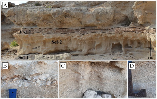 (A) General view of the Late Pleistocene deposits in the Es Estufadors area. (B) Detail of the second marine level (Sef-2), showing its internal structure and contact with overlying aeolian units. (C,D) Stratification of Sef-2, characterised by alternating fossil-rich and sandy laminae. These deposits rest unconformably above the colluvial facies Csf-2, which appears as a reddish silty-breccia at the base of the section. The underlying Csf-1 facies is not exposed in this outcrop, as it is very thin and located beneath the marine units, often masked by the irregular Miocene basement.