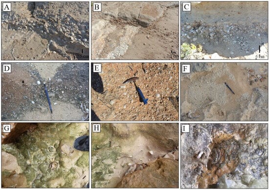 (A,B) General view or aspect of the second marine level characterised by the abundant presence of Glycymeris nummaria and Chamelea gallina in Es Copinar, Sef-2. (C–F) Abundant marine fauna is present in the second level of Es Ram, Sef-2. (G,H) Detailed views of the Sef-2 level at Caló des Mort, a newly identified exposure described here for the first time by the authors. The images show the sedimentary structure and stratification of this upper beach unit, Sef-1. (I) Close-up image of a karstic cavity (cocoons) filled with marine deposits, notably lacking Senegalese fauna, suggesting a distinct depositional or post-depositional environment compared to nearby fossil-rich levels, Sef-3.