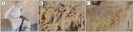 In the Es Estufadors sector, the middle beach level (Sef-2) is well-exposed and is characterised by a predominance of bivalve species, including Chamelea gallina, Glycymeris bimaculate, and Glycymeris nummaria. In the lower portion of this level, lenses of red algae, approximately 10 cm thick, are also present. These are followed by a sequence of sandy layers (ES2, ES5), which contain a high abundance of echinoid spines (Figure 7D), as well as fauna-rich levels dominated by fragmented shells within a sandy matrix—displaying a floastone texture—and the presence of completed adult specimens of Pecten jacobeus (approximately 10–12 cm diameter) (Figure 8A).