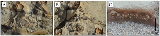 (A,B) Basin-shaped depressions carved into the Miocene basement infilled with modern marine sediments, rounded clasts, and anthropogenic materials, observed at Es Estufadors Sef-3. (C) Present-day beach level at Es Copinar, displaying a dense accumulation of marine fauna, including numerous echinoid spines.