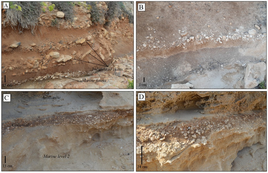 The palaeosols are composed of reddish-brown (HUE 5YR 6/8) silty to muddy sediments with a massive structure. They range in thickness from 15 to 50 cm and contain scattered, lens-shaped clast lags up to 30 cm thick. The lower part of the colluvial deposit is marked by an erosive basal contact and a high concentration of marine shell fragments (Figure 10B,C). Marine fauna identified in sample ES6 include Arca noae, Chama gryphoides, Chamelea gallina, Lima lima, Spondylus gaederopus, Bolma rugosa, Vermetus triquetrus, Lithothamnium sp., and abundant red algae (Figure 10B–D). The total thickness of the deposit ranges from 25 to 45 cm.
