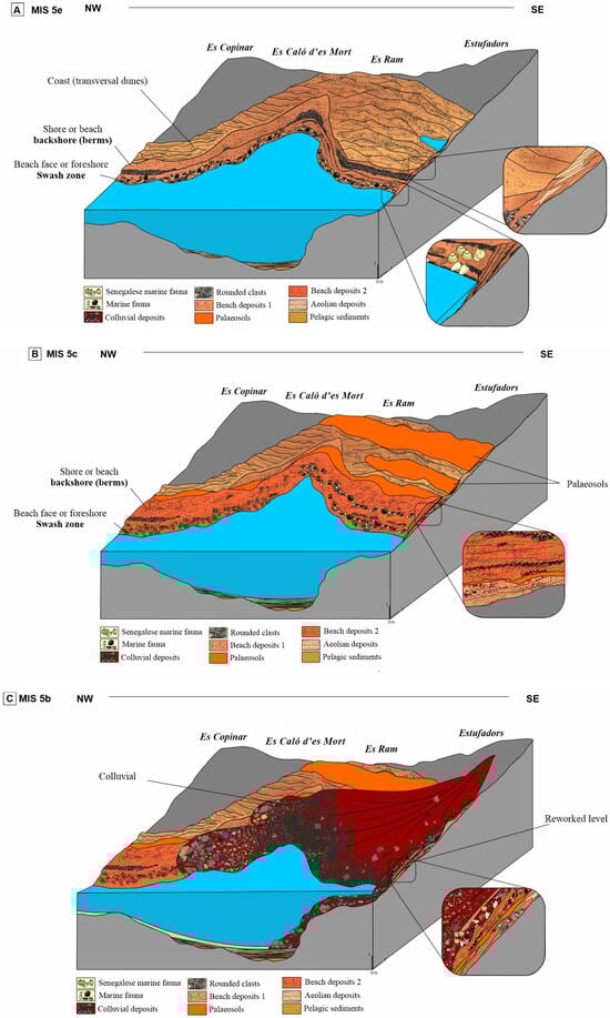 Geomorphological evolution model of Es Copinar to Es Estufadors area. (A) Interglacial substage MIS 5e. (B) interglacial MIS 5c and (C) cooler substage MIS 5b.