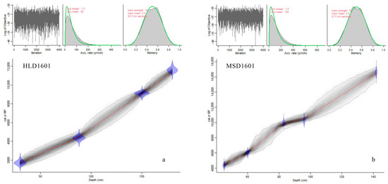 - Blaauw, M.; Christen, A.J. Flexible paleoclimate age-depth models using an autoregressive gamma process. Bayesian Anal. 2011, 6, 457–474. [Google Scholar] [CrossRef]