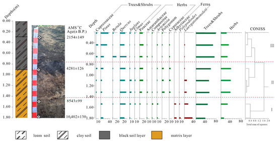 Prior to processing the samples, 50 g of samples was weighed, and stone pine (27,560/tablet) exotic spore markers were added to calculate the pollen concentration (grains/cm3). After chemical treatment with acid and alkali in the laboratory, samples underwent water changes to achieve neutrality before being subjected to centrifugation using a heavy liquid with a specific gravity greater than 2.1 for flotation. After removing the supernatant, it was then dehydrated by glacial acetic acid, cellulose was removed by an acetic anhydride-concentrated sulfuric acid mixture, it was centrifuged and exchanged for water for neutralization, and it was made into test tubes with glycerol for preservation. The number of pollen (in this context, “pollen” includes spores and pollen) identified per sample was more than 200. Based on the changes in the content of the main pollen types, the Xingkai Lake Plain 2 black soil profile was divided into pollen combination zones by Tilia software version 2.0.2 [20]. Additionally, the preparation and analysis of palynological samples were also performed by the same institute.