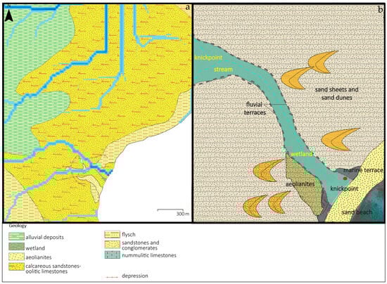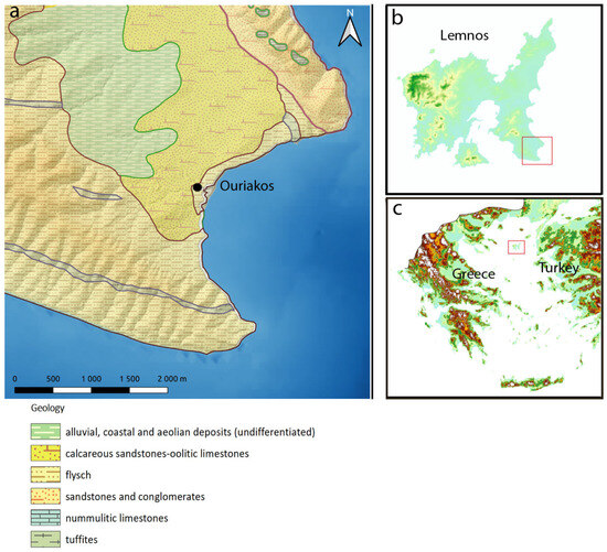 - IGME. Geological Map of Greece 1:50,000, Sheet Moudros; Geological Mapping by Scientists N. Roussos (1982, 1984, 1987) and A. Katsaounis (1982); IGME: Athens, Greece, 1993. [Google Scholar]