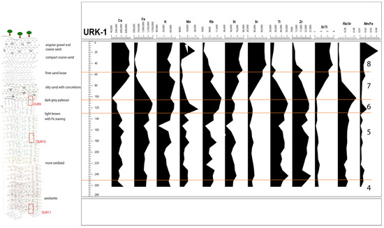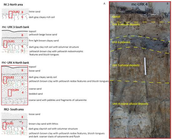 | Unit 6a | Dark-gray soil with blocky microstructure | Decalcified sandy loam–sandy silt loam, cross-striated clays, speckled Fe/Mn impregnations, sporadic calcareous infillings, channels with calcite-impregnated roots (queras), bioturbation features, and more oxidization in the lower part of the unit | Exposure-weak soil formation | OUR1 OUR2, OUR3 and OUR9 |