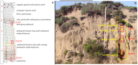 | Unit 5 | Yellowish–brown clays with strong brown redoximorphic features and intercalating bluish tongues | Yellowish–brown clays with impregnation redoximorphic features, rounded fragments of sandstone, few rounded calcareous nodules, and a vughy microstructure with crystallitic infillings and shells fragments | Alluvial deposits with indications of a fluctuating water table | OUR3 and OUR10 |