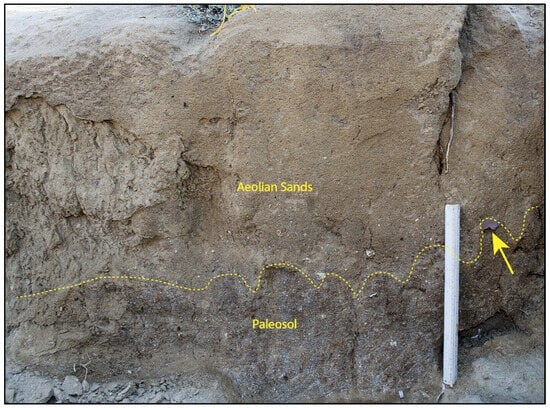 | Unit 7 | Firm sands | Moderately sorted loamy sand, cross-striated/crystallitic b/f fabric, subrounded to subangular 250–500 μm quartz, quartzite, calcite, olivine, calcareous and crystallitic coatings cementing the matrix, redoximorphic features, and a granular structure with many voids | Colluvial and/or aeolian? The cementation is probably due to vadose processes | OUR1, OUR5 and 9 |