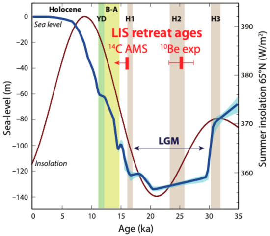 Contrasting age estimates for retreat of the southeastern margin of the Laurentide Ice Sheet (LIS), based on 14C AMS dating of terrestrial plant macrofossils in basal deglacial sediments [9] and on 10Be exposure dating of glacial pavement and boulders on a terminal moraine in the Allamuchy area of New Jersey [10]. Estimated ice-volume equivalent sea-level change (thick blue curve) since 35 ka is from [4], and summer insolation at 65° N (thinner maroon curve) is calculated with software from [11]. Labeled for context from [4] are the Last Glacial Maximum (LGM), Heinrich events H1, H2, and H3, Bolling–Allerod warm period (B-A), Younger Dryas cold period (YD), and the Holocene. See [9] for additional climate proxies and discussion.