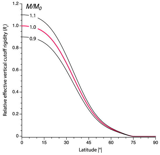 Effective vertical cutoff rigidity (Rc) relative to its maximum value as a function of geomagnetic latitude for a bracketing range of dipole moments (M) relative to the modern value (M0), using Equation (2) of [58].