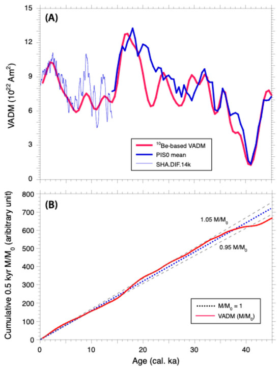 (A) Variations in virtual axial dipole moment (VADM) for 0–45 ka, based on SHA.DIF.14k for 0–14 ka [55] and relative paleointensity (RPI) stack for 14–45 ka [59], compared to 10Be-based VADM from ice cores [61] as assembled in [60]. (B) Cumulative 10Be-based VADM curve (from (A)) in nominal 0.5 kyr increments going back in time from the present (red curve), compared for reference to cumulative VADMs modeled for a constant dipole moment, M, relative to the present value, M0 (dotted and dashed lines).