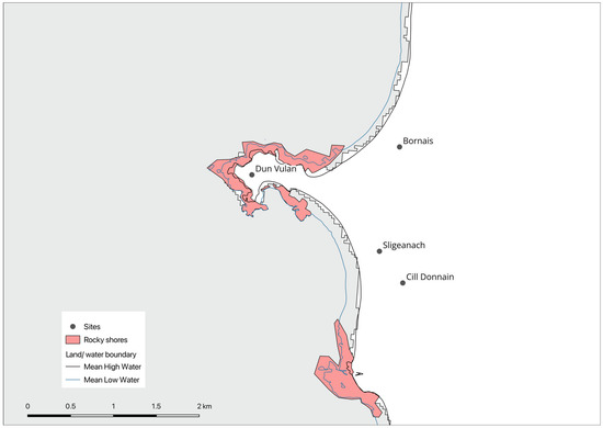 Map showing coastal rock outcrops around the Cill Donnain/Bornais area of South Uist, which may have been sources of limpets and winkles. Contains Ordnance Survey data. Crown © and database right 2025.