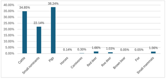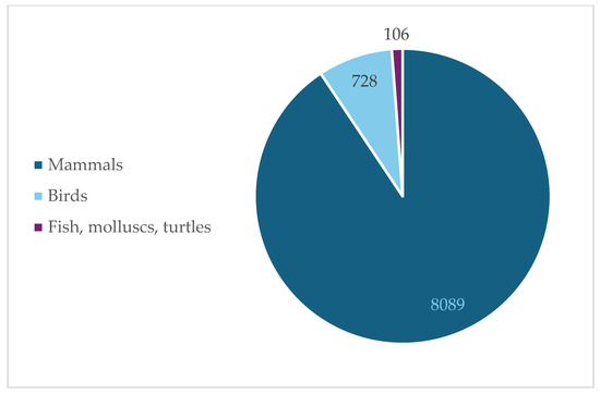 Archaeozoological excavations revealed 25,739 animal remains, consisting of bones, teeth, and horns or antlers, out of which 34.7% (N = 8923) were identified. Most of the identified remains belonged to mammals. Furthermore, the remains of birds, fish, molluscs, and turtles were also identified, though in very small numbers (Figure 2).