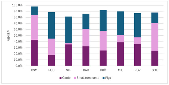 Cattle and small ruminant remains (i.e., sheep and goats) were identified at all of the investigated sites. Since it was not possible to determine for all specimens in the total sample of small ruminants whether they belonged to sheep or goats, and to increase the sample size and strengthen the statistical test, sheep and goats were analysed together under the category of small ruminants. As seen from Figure 4, cattle were the most represented species at sites BSM (42.8%) and STR (35.4%), both monasteries, as well as at two noble sites, MIL (38.9%) and PGV (36%). The percentage of small ruminant remains was the highest for the noble site SOK, with 45.7%, and monastic site BSM, with 40.8%. Cattle and small ruminant remains were the least represented at two monasteries, RUD and STR.