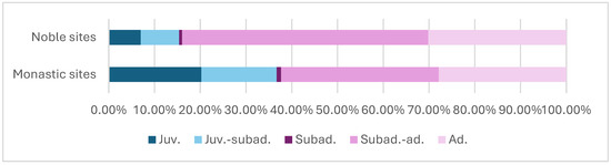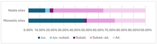 Figure 7. Proportion of age groups for sheep at monastic and noble sites. Juv.—juvenile; juv.-subad.—juvenile–subadult; subad.—subadult; subad.-ad.—subadult–adult; ad.—adult individuals.