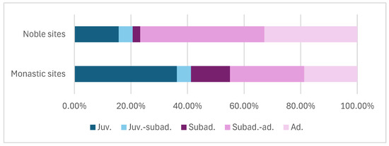 Figure 5. Proportion of age groups for cattle at monastic and noble sites. Juv.—juvenile; juv.-subad.—juvenile–subadult; subad.—subadult; subad.-ad.—subadult–adult; ad.—adult individuals.