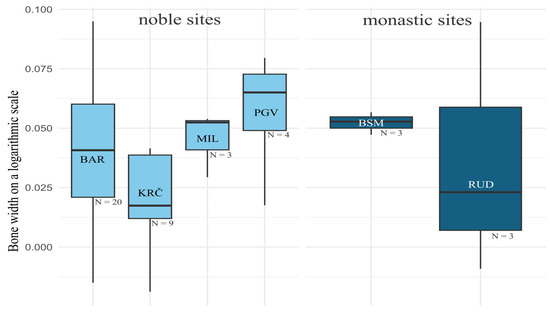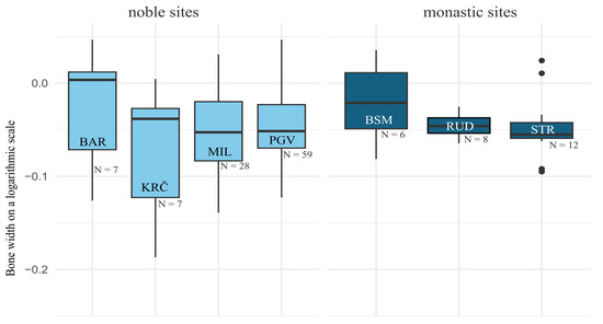 where the observed measurement refers to the measurement of the analysed sample, and the standard measurement refers to that of a reference animal [43]. Measurements for the reference animals were obtained from the website of the Integrative Prehistory and Archaeological Science (IPAS) research group at the University of Basel (Bos taurus, Inv. no. 2426; Ovis aries, Inv. no. 2448) [44]. To identify differences, sites were grouped into monastic (RUD, BSM, and STR) and noble sites (MIL, PGV, BAR, SOK, and KRČ) (Figure 1). A Mann–Whitney U test was applied to compare the transformed logarithmic bone width data between the two groups. The data were graphically displayed using box plots for all archaeological sites, and were also grouped into monastic and noble sites. The box plots showed the first quartile (25% of data), the second quartile (median), the third quartile (75% of data), as well as the minimum and maximum values and outliers.
