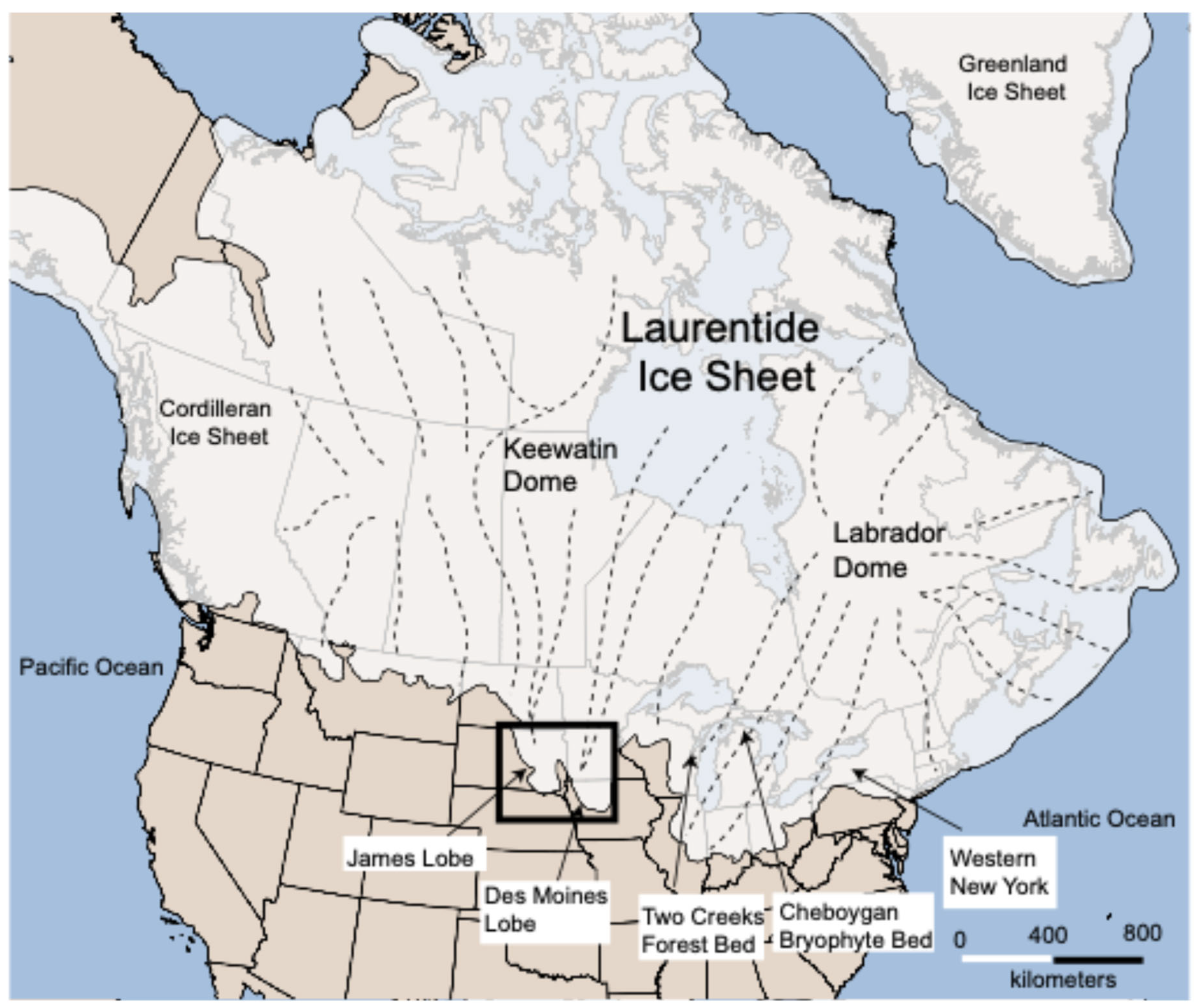 Figure 1. The maximum extent of the Laurentide Ice Sheet during the last glacial period. The dashed lines represent approximate flow lines, after Denton and Hughes (1981) [5]. The James Lobe is outlined by a black box and is detailed in Figure 2. Also noted are place names as mentioned in the text.