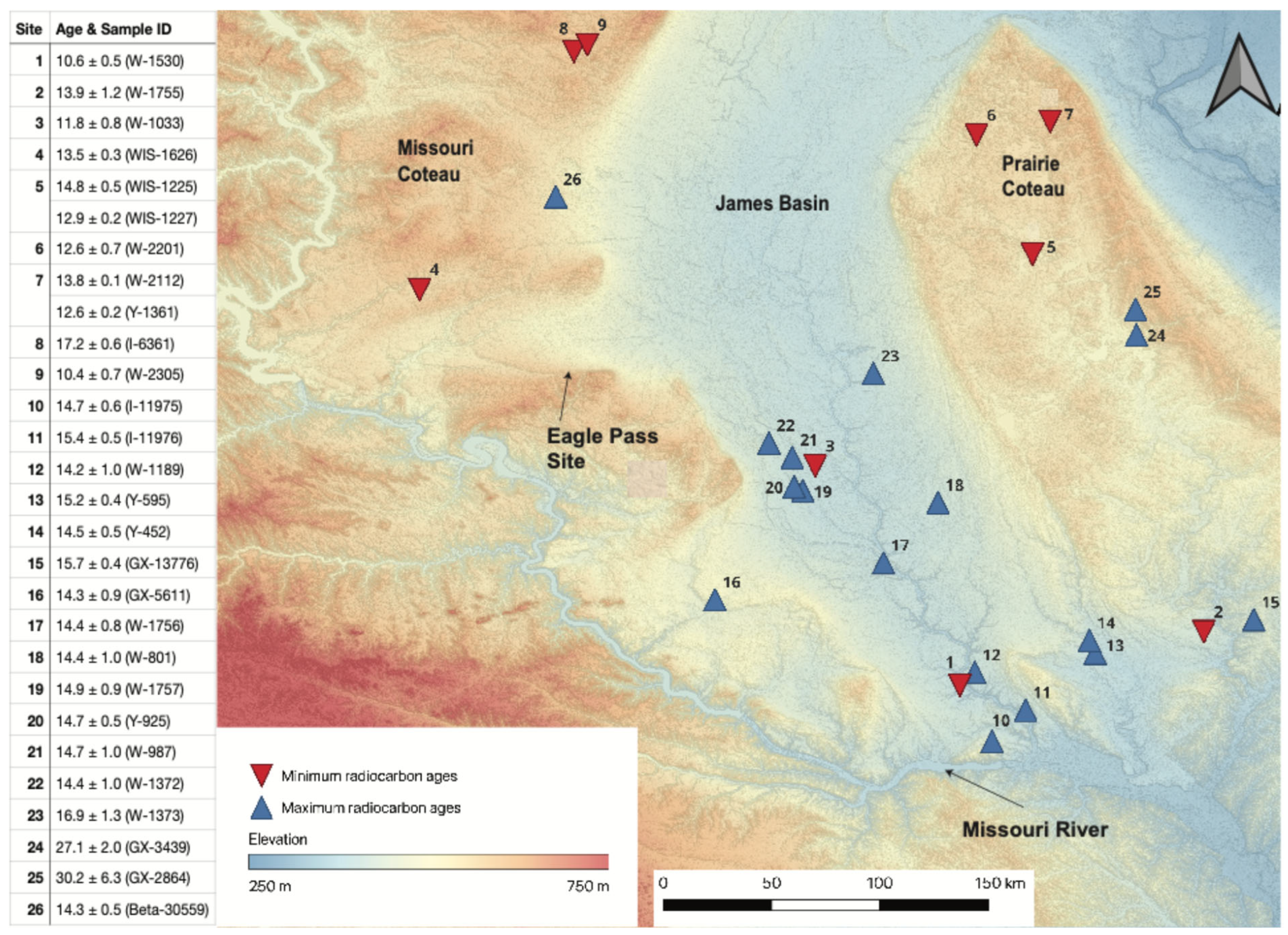 Figure 2. A digital elevation model of the James Lobe in eastern South Dakota. Significant landmarks are labeled in bold. South Dakota county names are labeled in italics. Blue triangles represent locations of maximum radiocarbon ages. Red inverted triangles represent the locations of minimum radiocarbon ages. Radiocarbon ages are presented as thousands of years before present (ka) followed by the sample lab number. The green star represents Eagle Pass Site [12].