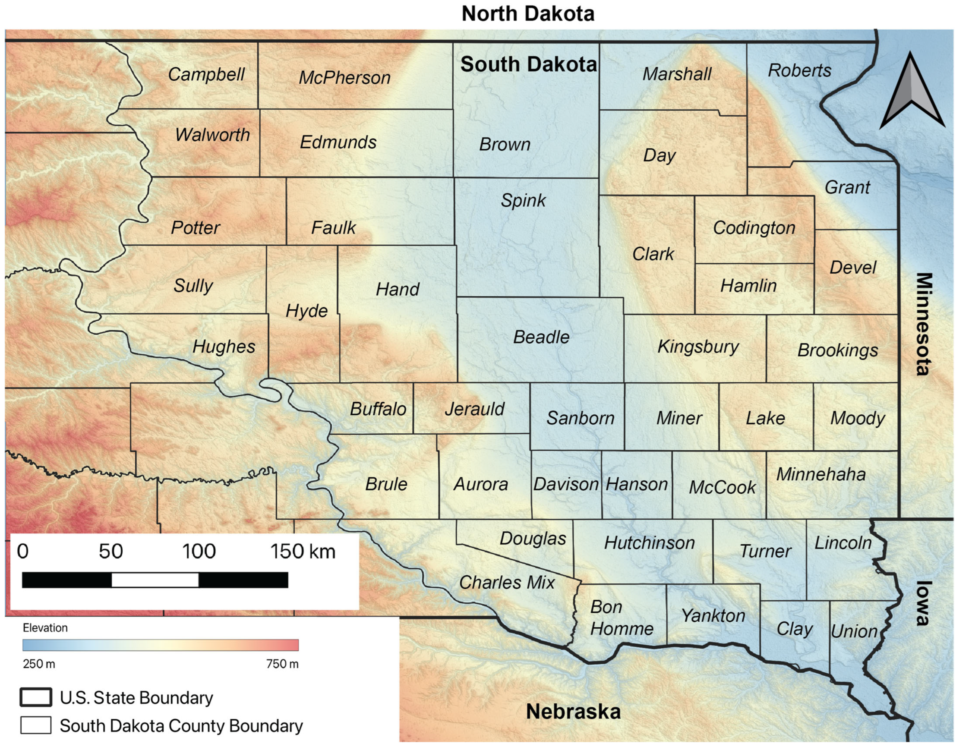 Figure 3. Counties and place names of eastern South Dakota as referenced in the text. State names are indicated in bold font, and county names are indicated in italics.