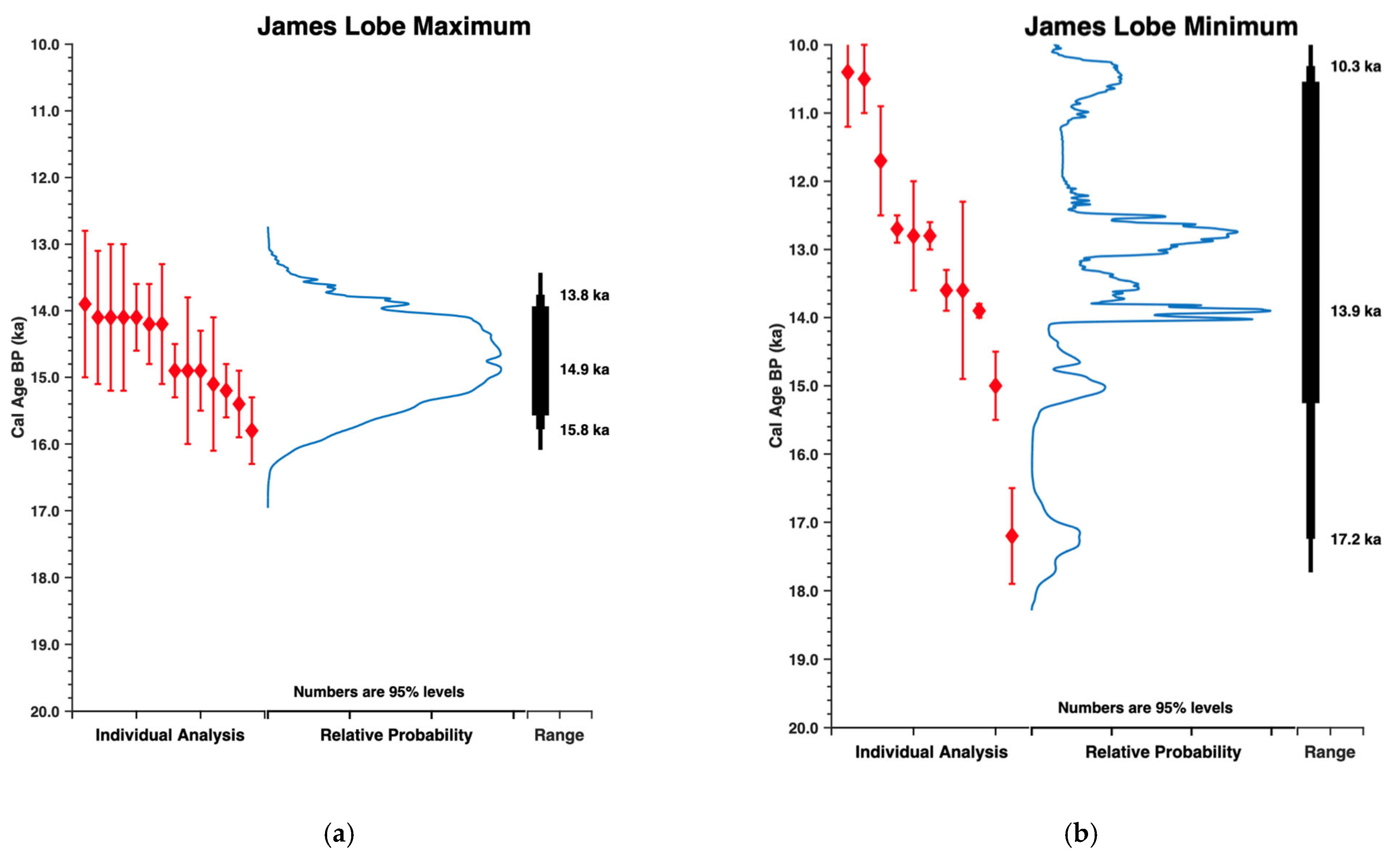In this section, we will compare the timing of interstadial conditions in the James Lobe between ~15.8 and 13.7 ka and its subsequent advance with other southern Laurentide lobes with radiocarbon chronologies of similar stratigraphic context. We compare the computed 95% confidence limit radiocarbon ages from each site (Figure 6).