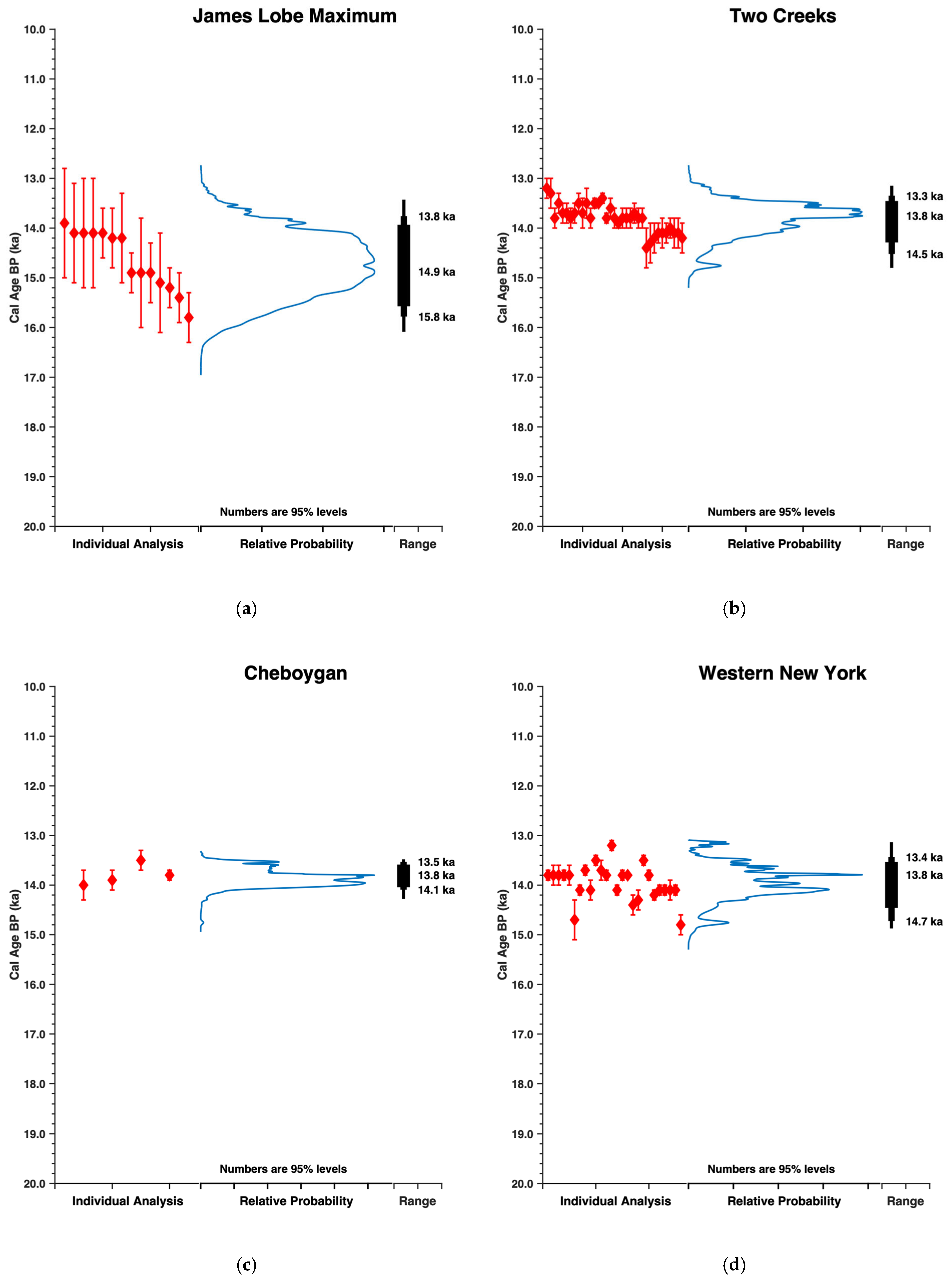 Figure 6. Correlation along the southern margin of the Laurentide Ice Sheet. These come from maximum stratigraphic positions, and thus the 95% younger value should be used for comparisons. By this approach, 13.8 ka, 13.3 ka, 13.5 ka, and 13.4 ka represent the timing of advance along ~1000 km of the southern margin of the Laurentide Ice Sheet. (a) The James lobe, from this report, (b) the Two Creeks Forest Bed (only those analyses with errors 200 yr or less) [64,65,66,67], (c) the Cheboygan Bryophyte Bed [68], (d) the Buttermilk and Avon sites of Western New York [69].