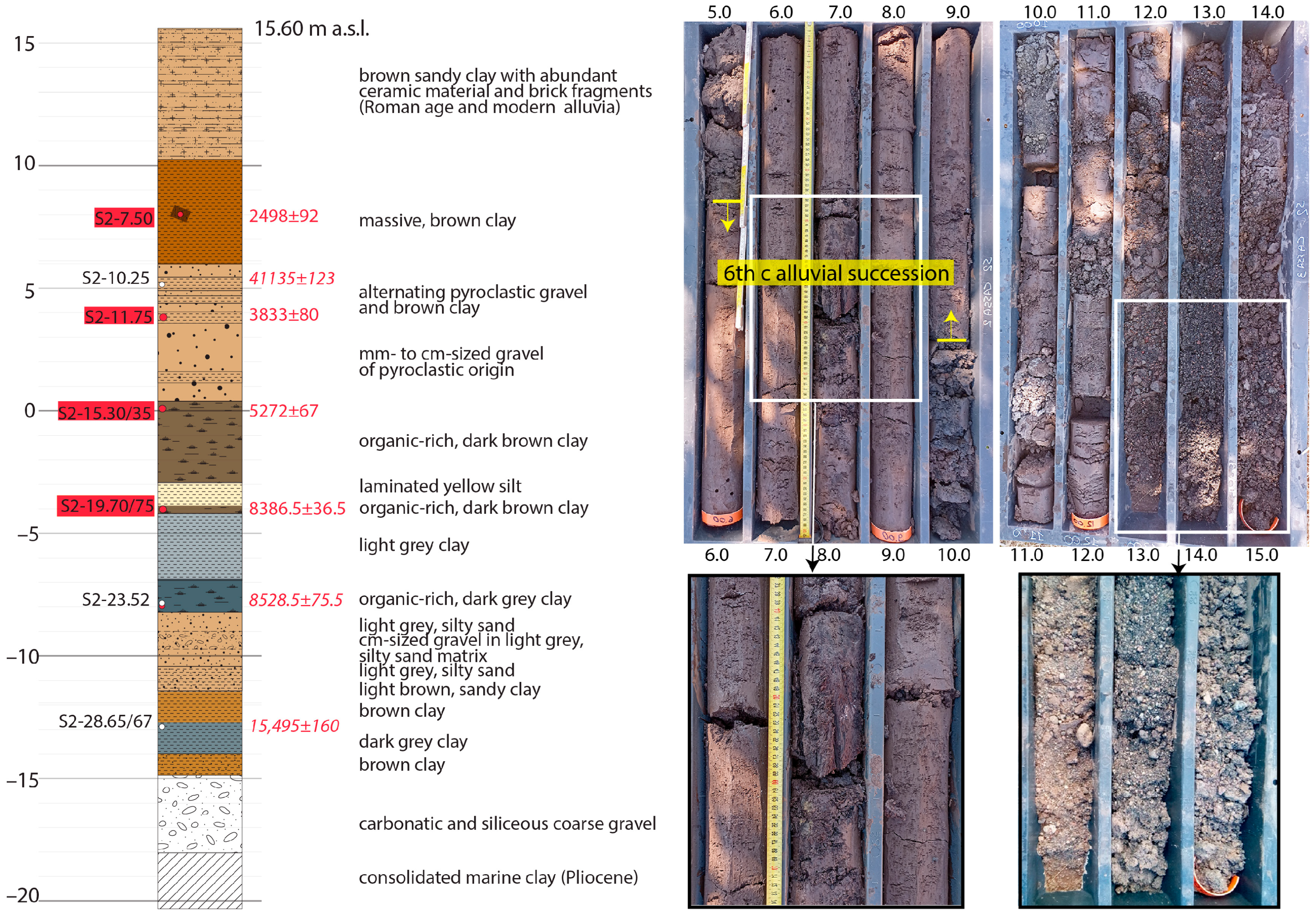 - 6th Century alluvial succession (~2.55–2.45 ka). Light grey to yellowish clay, sometimes thinly laminated, devoid of anthropic and organic material, with a ~10 cm thick layer of fine gravel (Ø ≤ 2 cm) including sub-angular tuff and ceramic fragments at the base.