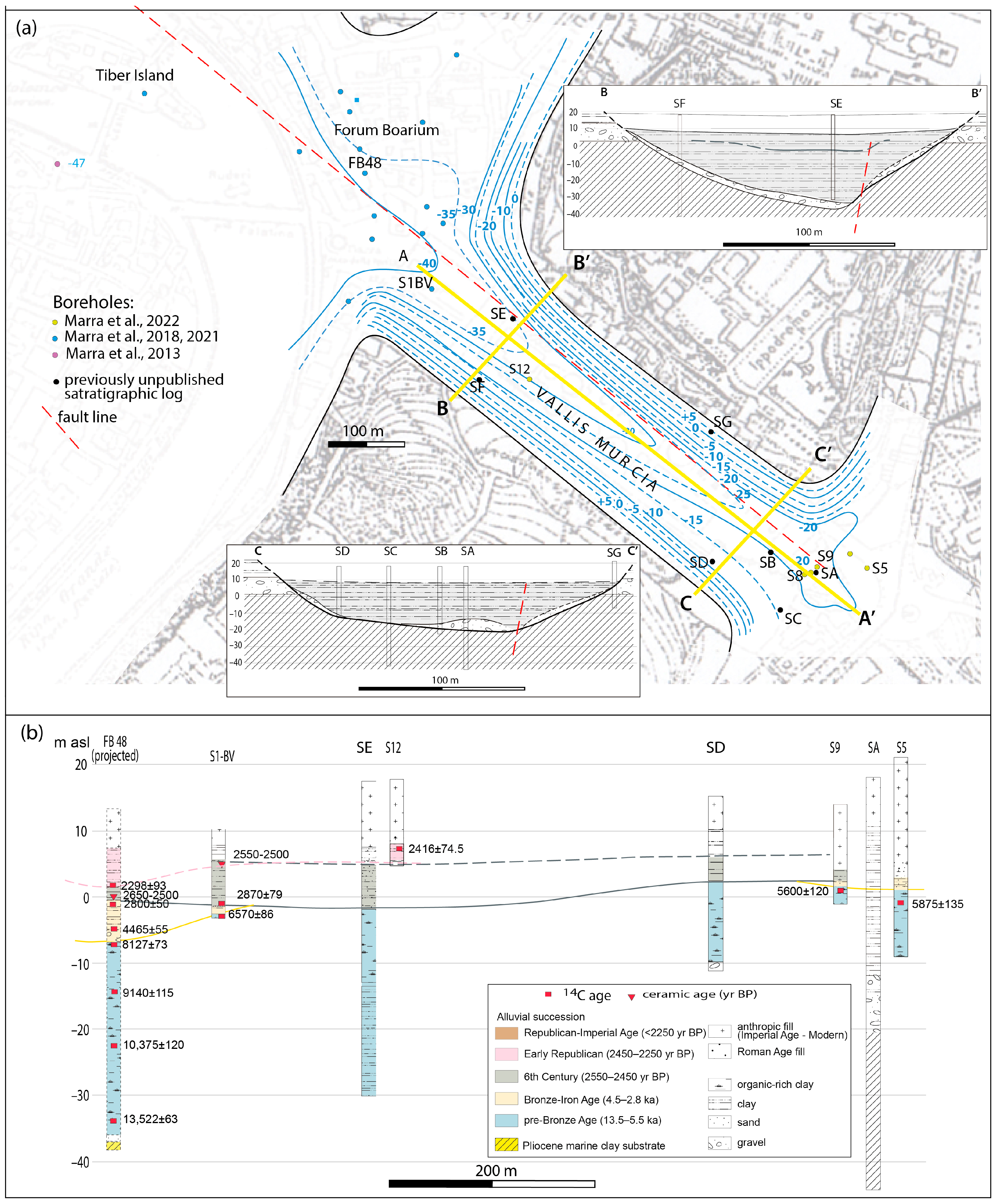 - Marra, F.; Motta, L.; Brock, A.; Macrì, P.; Florindo, F.; Sadori, L.; Terrenato, N. Rome in its setting. Post-glacial aggradation history of the Tiber River alluvial deposits and tectonic origin of the Tiber Island. PLoS ONE 2018, 13, e0194838. [Google Scholar] [CrossRef] [PubMed]