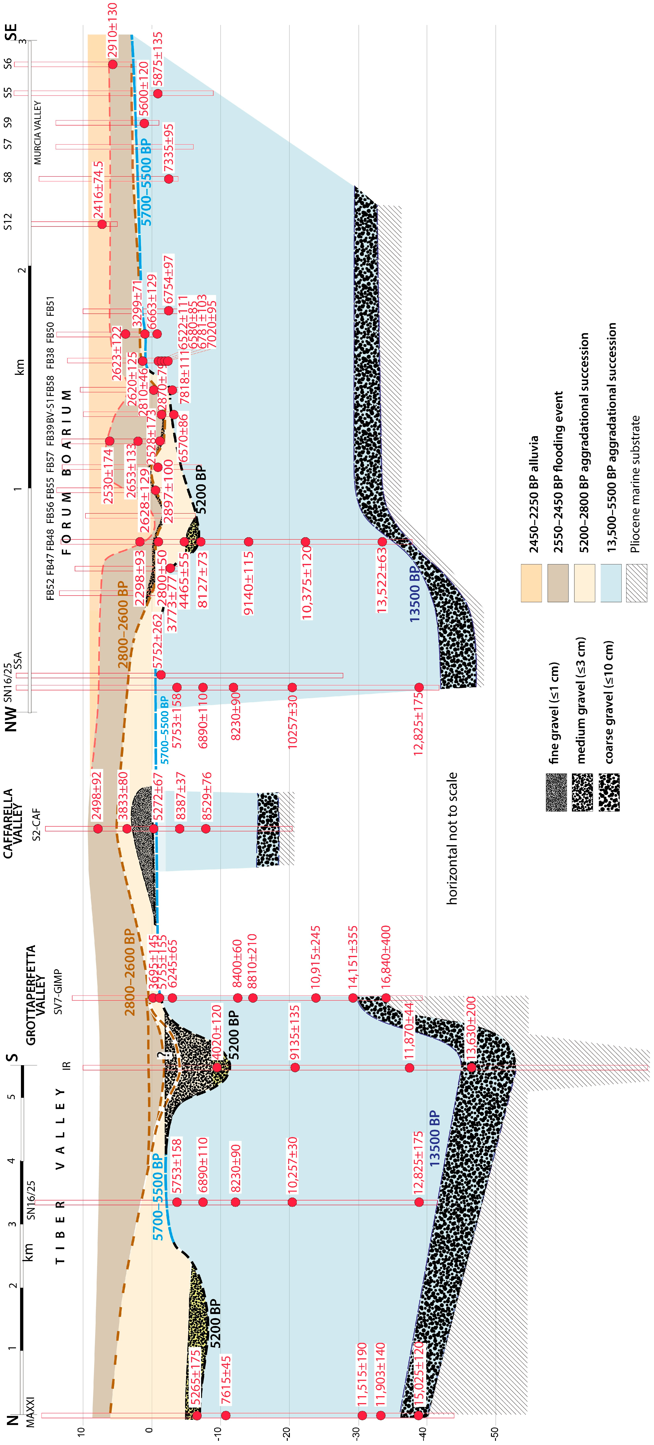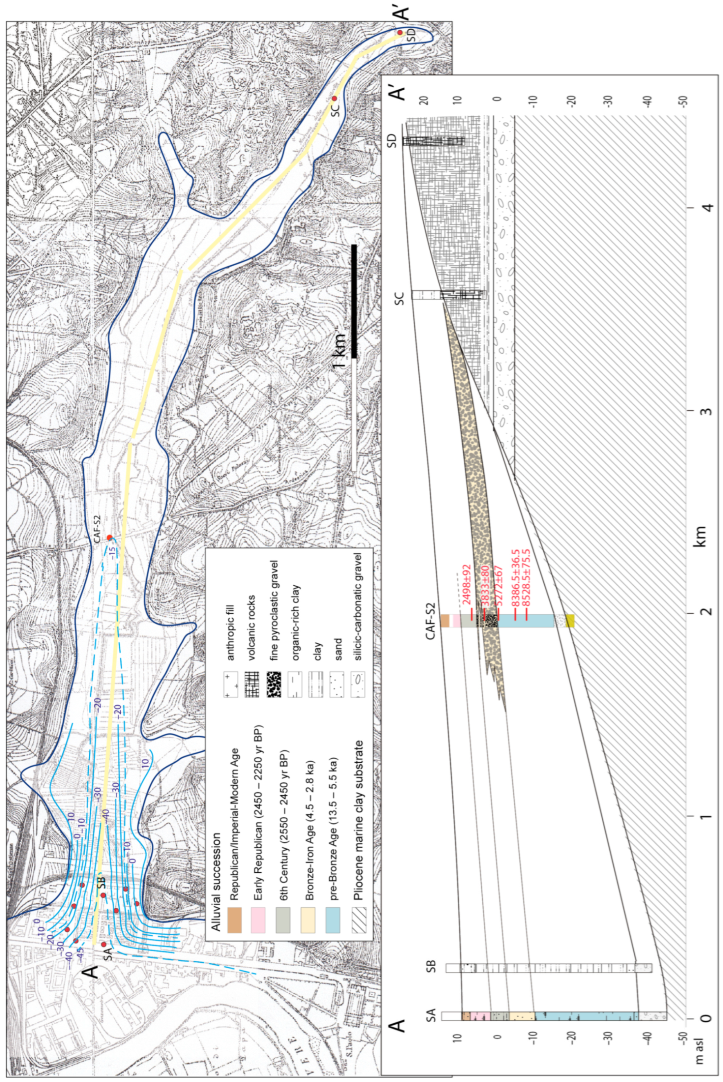 - Early Republican to Modern Age alluvial succession (<2.45 ka). Heterogeneous yellow to brown sandy clay sediments, including frequent fragments of anthropic materials.