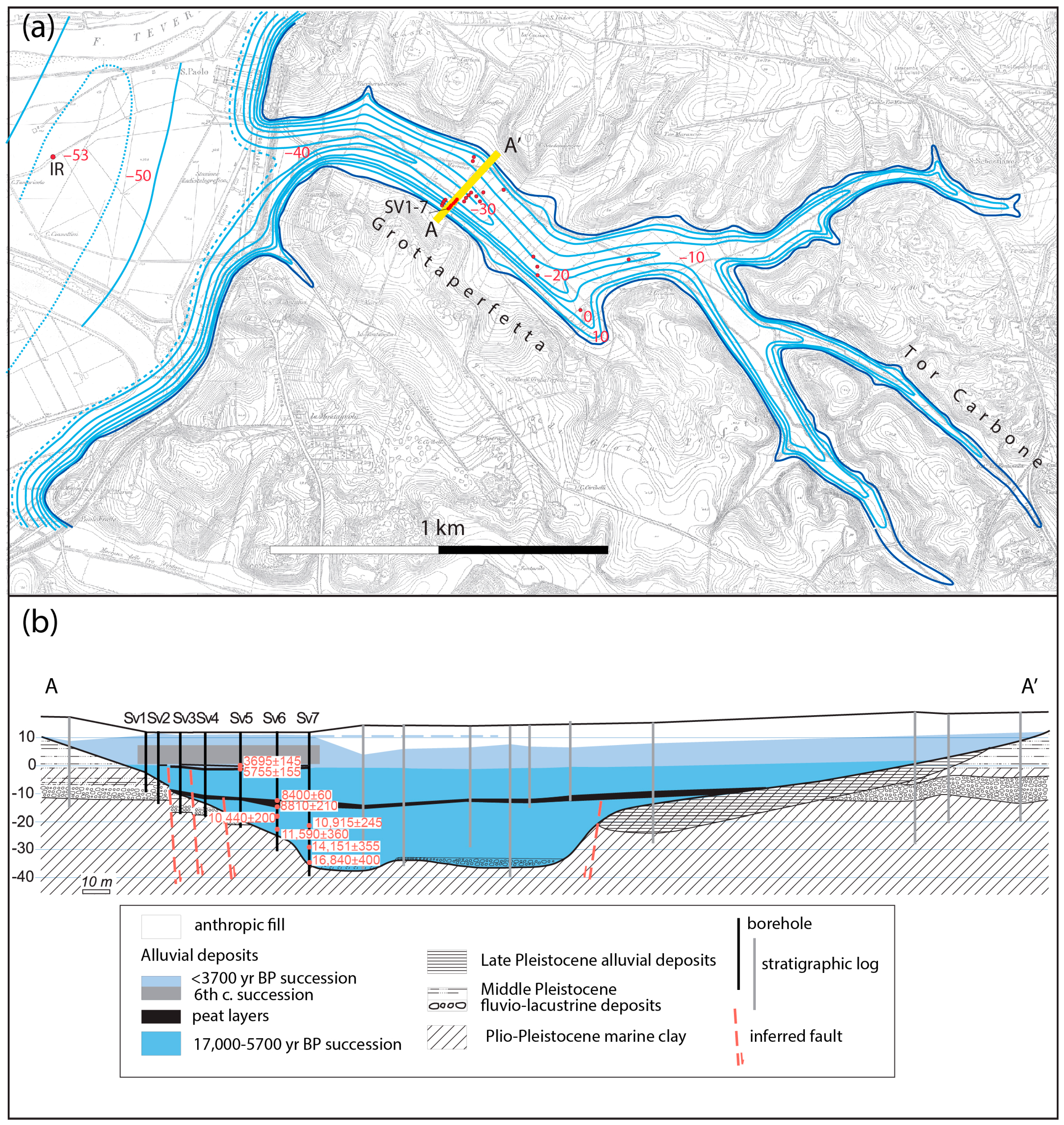- one 35 m deep borehole (CAF-S2) drilled in the Caffarella Valley (Figure 1) aimed at recovering the complete post-glacial alluvial succession, drilled by Fondazione Amici di Italia Fenice as part of a Geological Monograph Project on the Caffarella Valley and with the permission of the Ente Regionale Parco dell’Appia antica and of the Parco Archeologico dell’Appia antica;